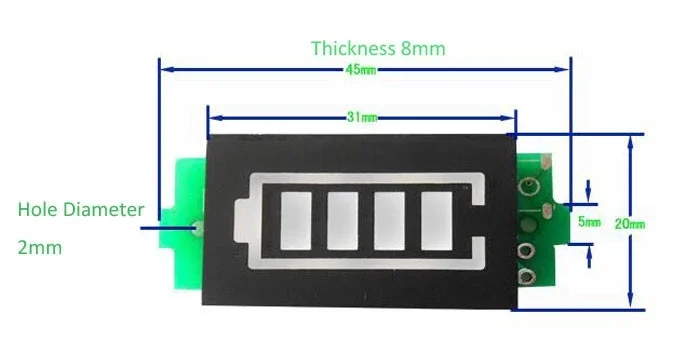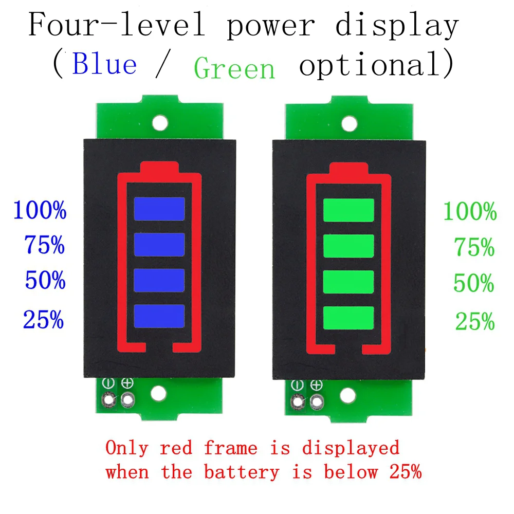 1.Battery type electricity quantity display 2.Wide application fields:lithium battery 3.Using Method:connect display board positive and negative port with tested battery positive and negative port,digital tube will display real-time battery electricity quantity 4.Digital Color:outline red,display block blue (when battery electricity quantity is full,it will be all on) Display Electricity Quantity Parameter: 1.When battery voltage is over N*3.3V,it will illuminate 1 block electricity quantity (note:N represents battery quantity) 2.When battery voltage is over N*3.5V,it will illuminate 2 blocks electricity quantity 3.When battery voltage is over N*3.7V,it will illuminate 3 blocks electricity quantity 4.When battery voltage is over N*3.9V,it will illuminate 4 blocks electricity quantity 5.When battery voltage is less than N*3.3V,4 blocks display will be off;it represents battery is less than 3.3V,and you can charge the battery