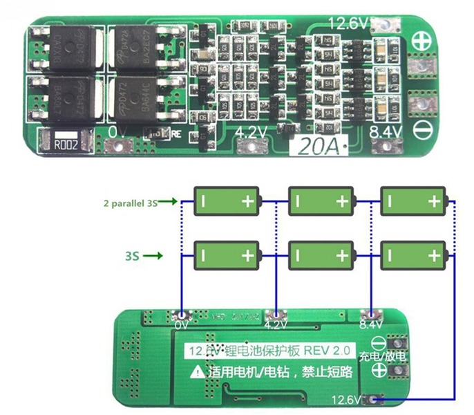 Charging voltage: 12.6VMaximum output current: 20AMaximum output power / charging power: 252WColor: GreenMaterial: P,C,B Size: L*W*H: 59*20*3.4mm(2.32*0.79*0.13in)Note: Do not mix the good battery and poor battery to use. The internal resistance of 3 battery capacity are closer will be betterMaterial: Made of P,C,B material, high quality and durable to useSize: L*W*H: 59*20*3.4mm(2.32*0.79*0.13in)Application: For nominal voltage of 3.6V, 3.7V lithium battery (including 18650,26650, polymer lithium battery)Over discharger protection: Over current protection can ensure the security of battery pack